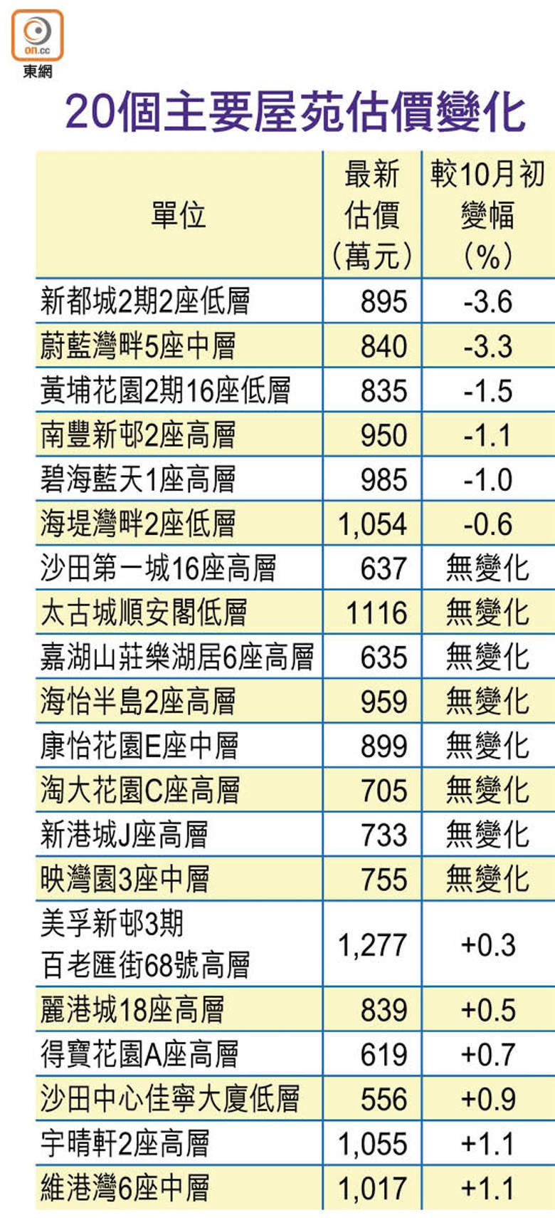 其餘3個估價回落屋苑,分別為鰂魚涌南豐新邨、長沙灣碧海藍天及東涌海堤灣畔,較10月初下跌介乎約0.6至1.1%不等。