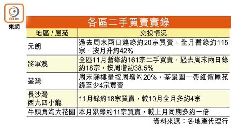 該行王勤學亦稱,多個新盤銷售屆尾聲,大批向隅客回流元朗二手市場,剛過去的周末尚悅錄約4宗買賣最多,項目6座低層連平台戶,實用面積約928方呎,套三房間隔,平台面積約1,041方呎,連車位叫價1,490萬元,減價62萬元獲家庭客購入,成交價1,428萬元,呎價約15,388元,物業升值約8%。而元朗區11月暫錄約115宗二手買賣,按月升約42%。